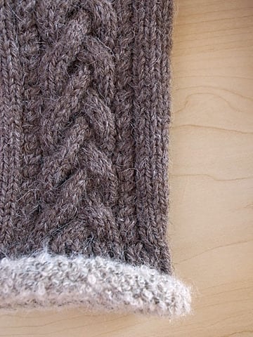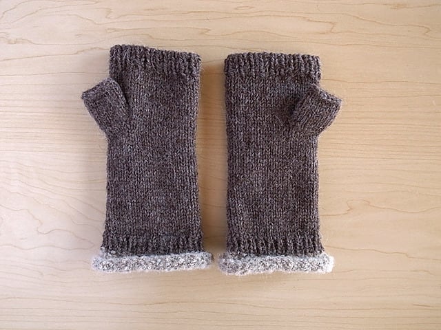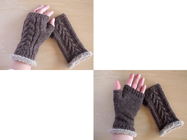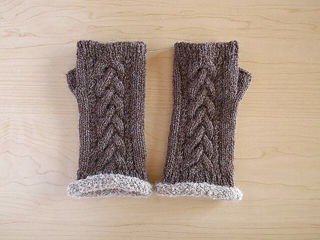 ベビーアルパカとウールの混紡糸でアラン模様のハンドウォーマーを編みました。