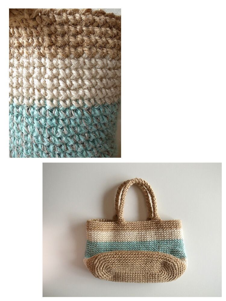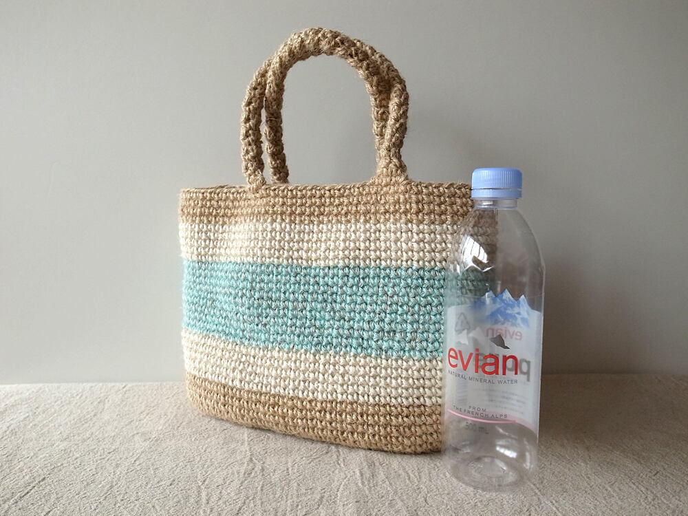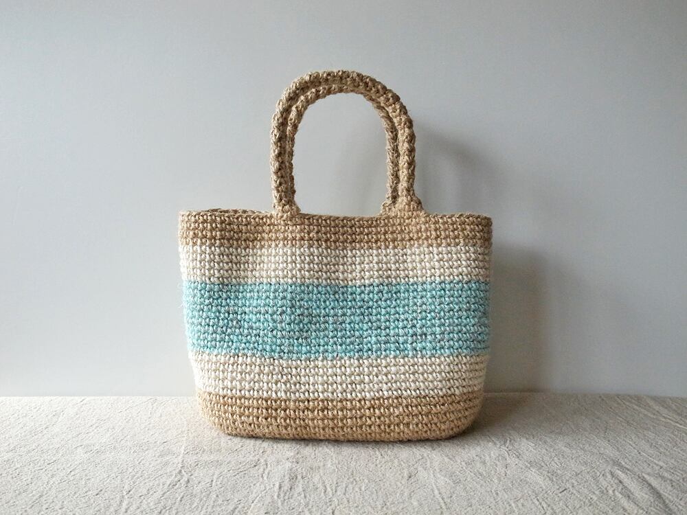 生成りの麻ひもで編んだ楕円底のバッグ。