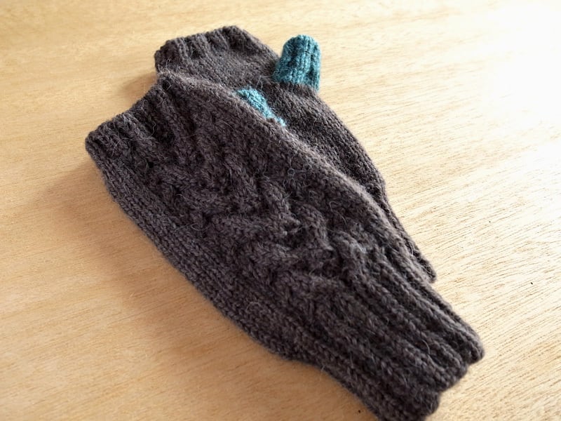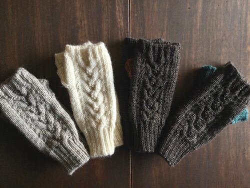 ベビーアルパカとウールの混紡糸でアラン模様のハンドウォーマーを編みました。