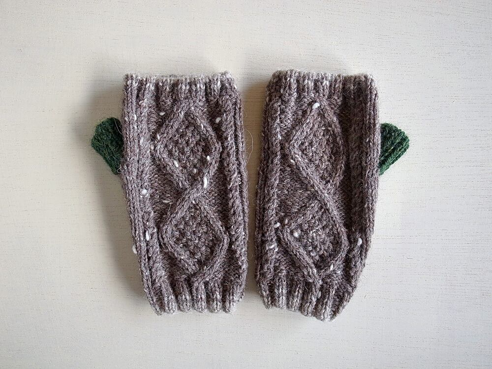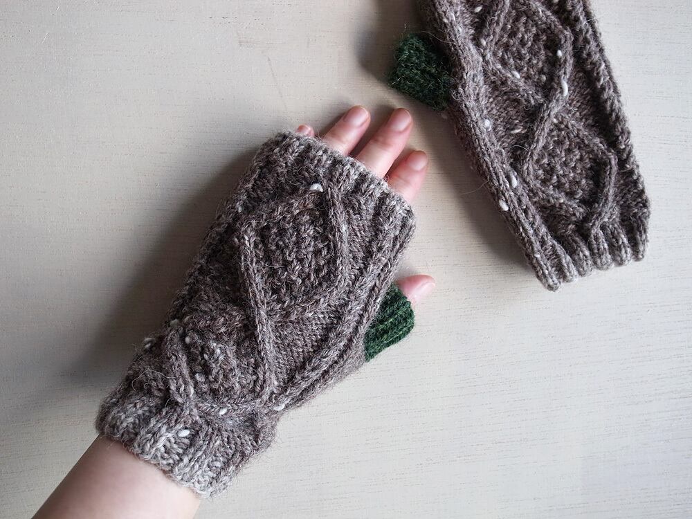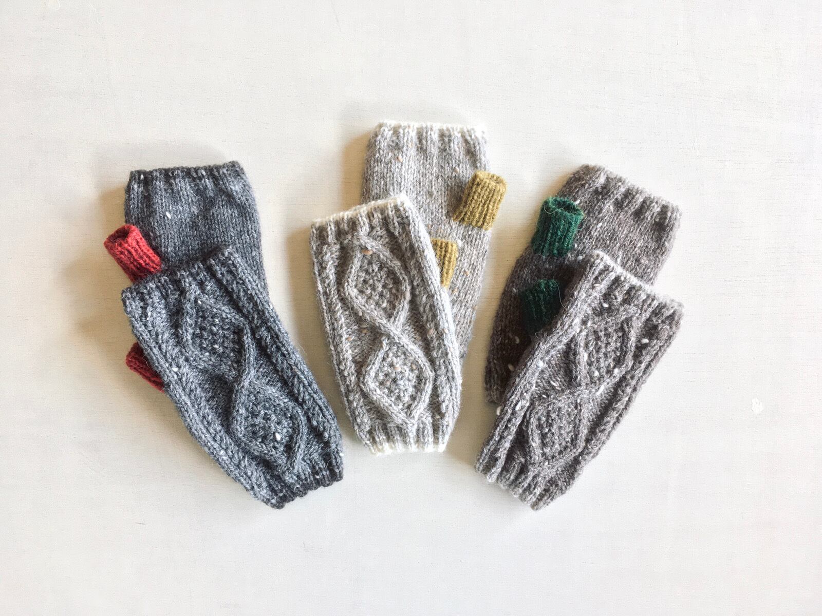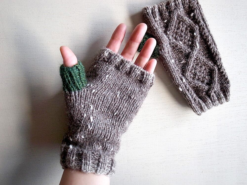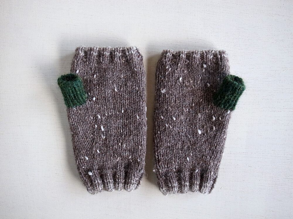 軽くて暖かいツイードヤーンで指なしのミトンを編みました。