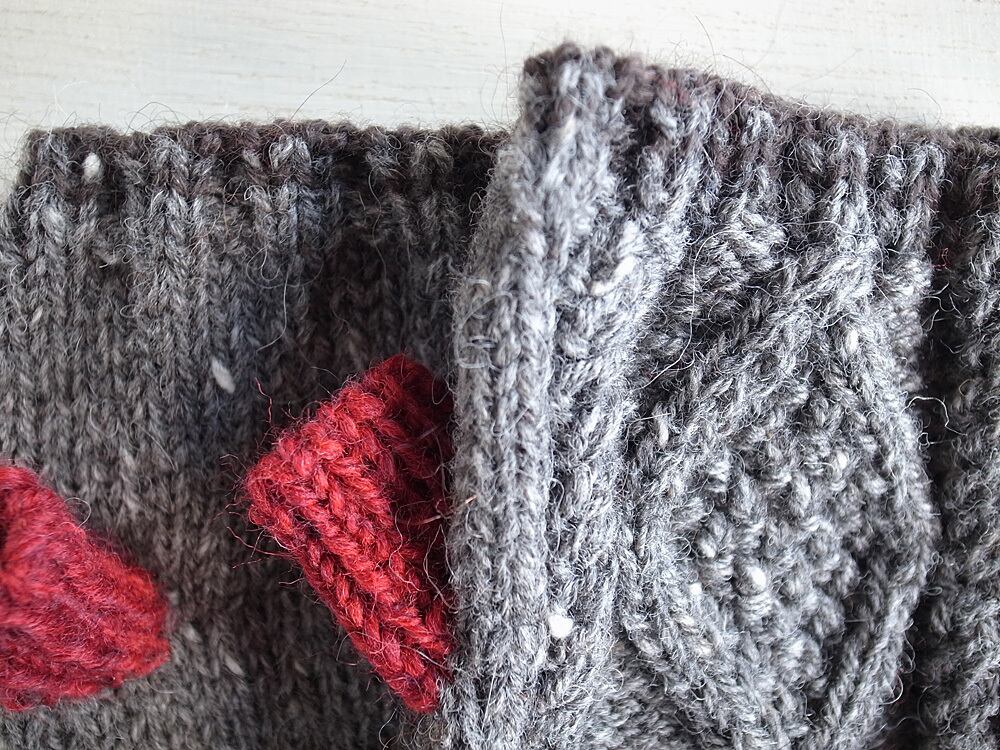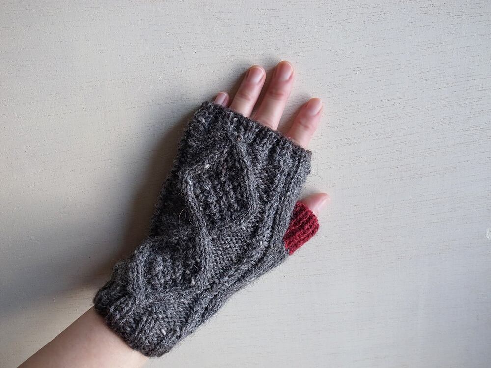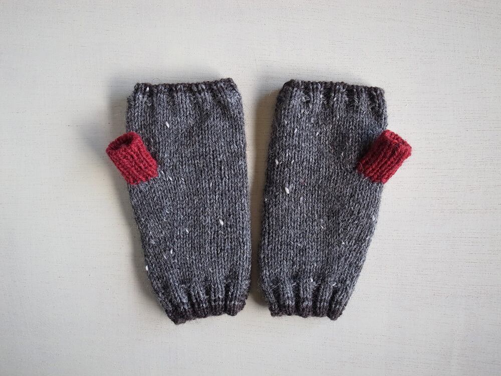 軽くて暖かいツイードヤーンで指なしのミトンを編みました。