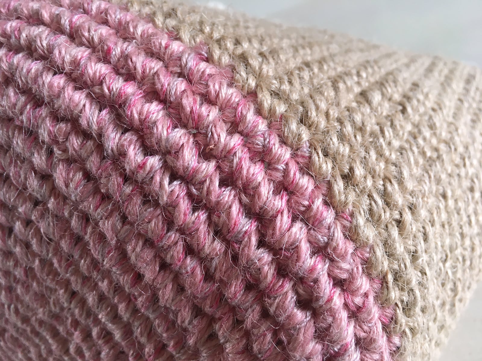 底部分はピンクの糸を4種類引き揃えて編んでおり、淡色ながら深みと風合いが感じられます。